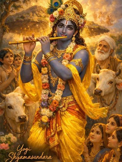 I bow to Shyam Sundar, who delights all the Gopis. He who resides in the grove nourishes everyone's souls just as the sun's presence causes the lotus to bloom. I bow to the divine being who fulfils the desires of His devotees, whose graceful glances destroy sorrows, and who plays the most enchanting melodies on His flute, captivating the hearts of all with His divine presence.