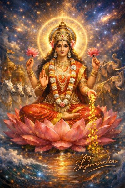 Invoke for me, O Agni, Lakshmi who shines like gold, is brilliant like the sun, who is powerfully fragrant, who wields the rod of suzerainty, who is of the form of supreme rulership, who is radiant with ornaments and is the goddess of wealth. Invoke for me, O Agni, the Goddess Lakshmi who shines like gold, blooms like the moon, who is fresh with anointment (of fragrant scent), who is adorned with the lotuses (lifted up by celestial elephants in the act of worship), who is the presiding deity of nourishment, who is yellow in color, and who wears garlands of lotuses.